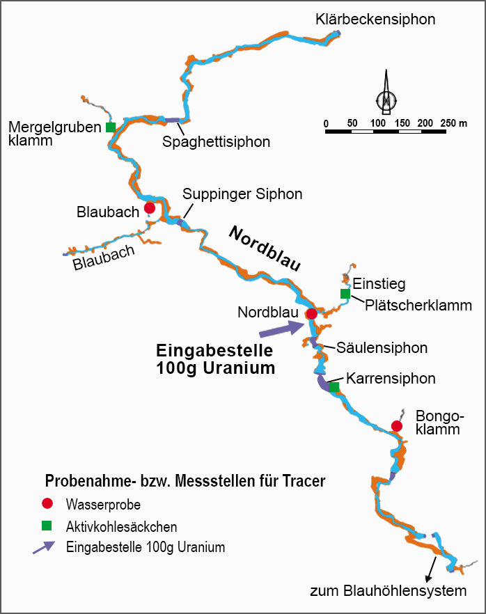 Am 21. April 2012 wurde erstmals ein kombinierter Markierungsversuch mit direkter Tracereingabe in der Blauhöhle (Sulforhodamin G) und der Hessenhauhöhle (Uranin) durchgeführt (Lauber et al., 2013a; Lauber et al., 2013b; Lauber et al., 2013c). In der Blauhöhle fließt die „Ur-Blau“, der Höhlenbach in der Hessenhauhöhle wird als „Nord-Blau“ bezeichnet. Ihr Südende liegt ca. zwei Kilometer nördlich der Blauhöhle.