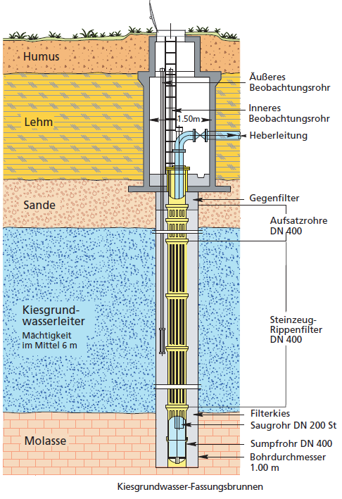 Beispiel (schematisch) eines Brunnenausbaus im Langenauer Donauried (Grafik: Landeswasserversorgung, 2012).