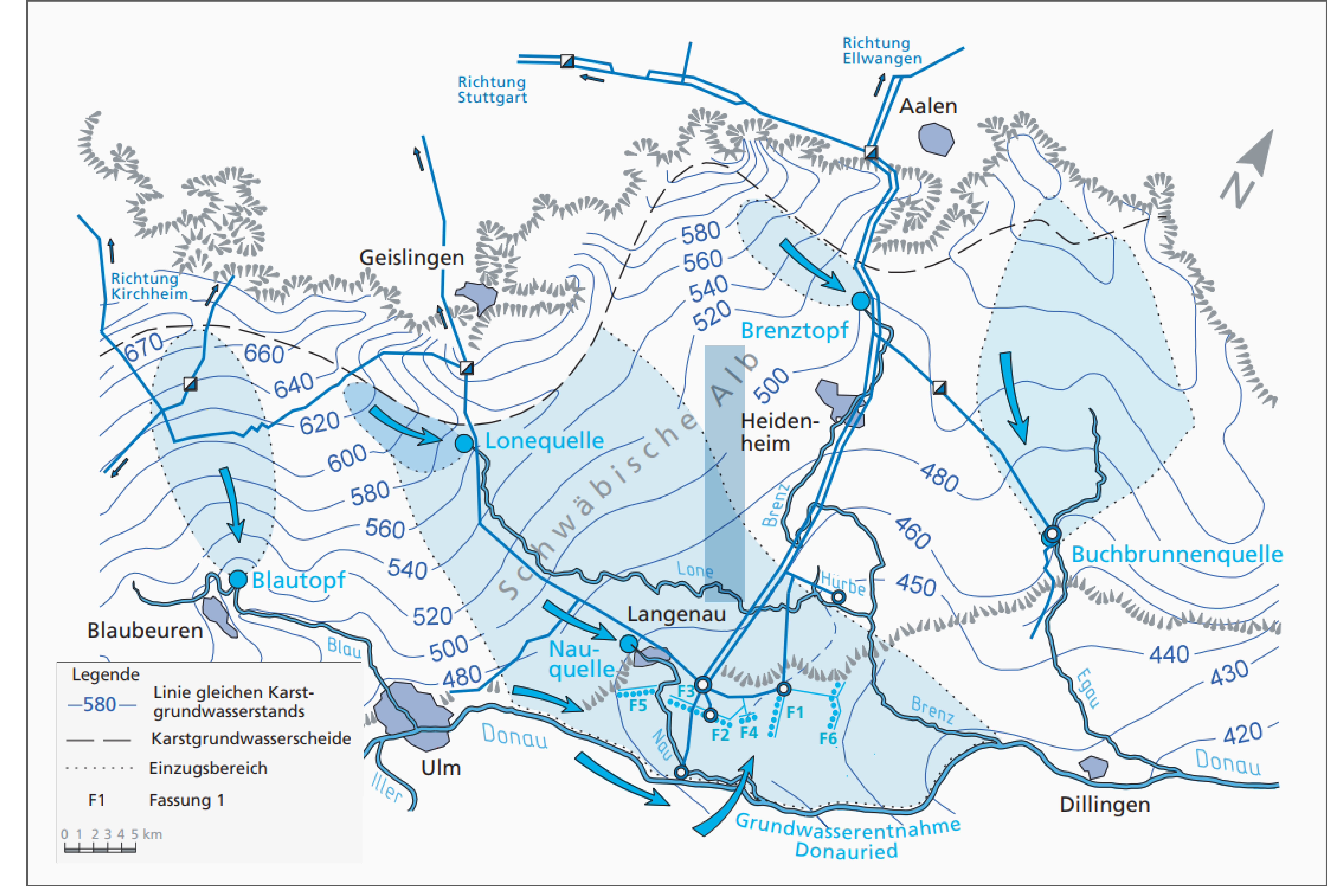 Der Hauptzustrombereich zu den Fassungen der LW im Langenauer Donauried erfolgt aus dem Karstgrundwasserleiter der Schwäbischen Alb nordwestlich bis nördlich des Rieds (s. Abb. oben). Im Norden reicht er bis zur unterirdischen Karstwasserscheide. Dieses Gebiet hat eine Größe von ca. 340 km2. Das Einzugsgebiet des gesamten württembergischen Donaurieds ist ca. 400 km2 groß.