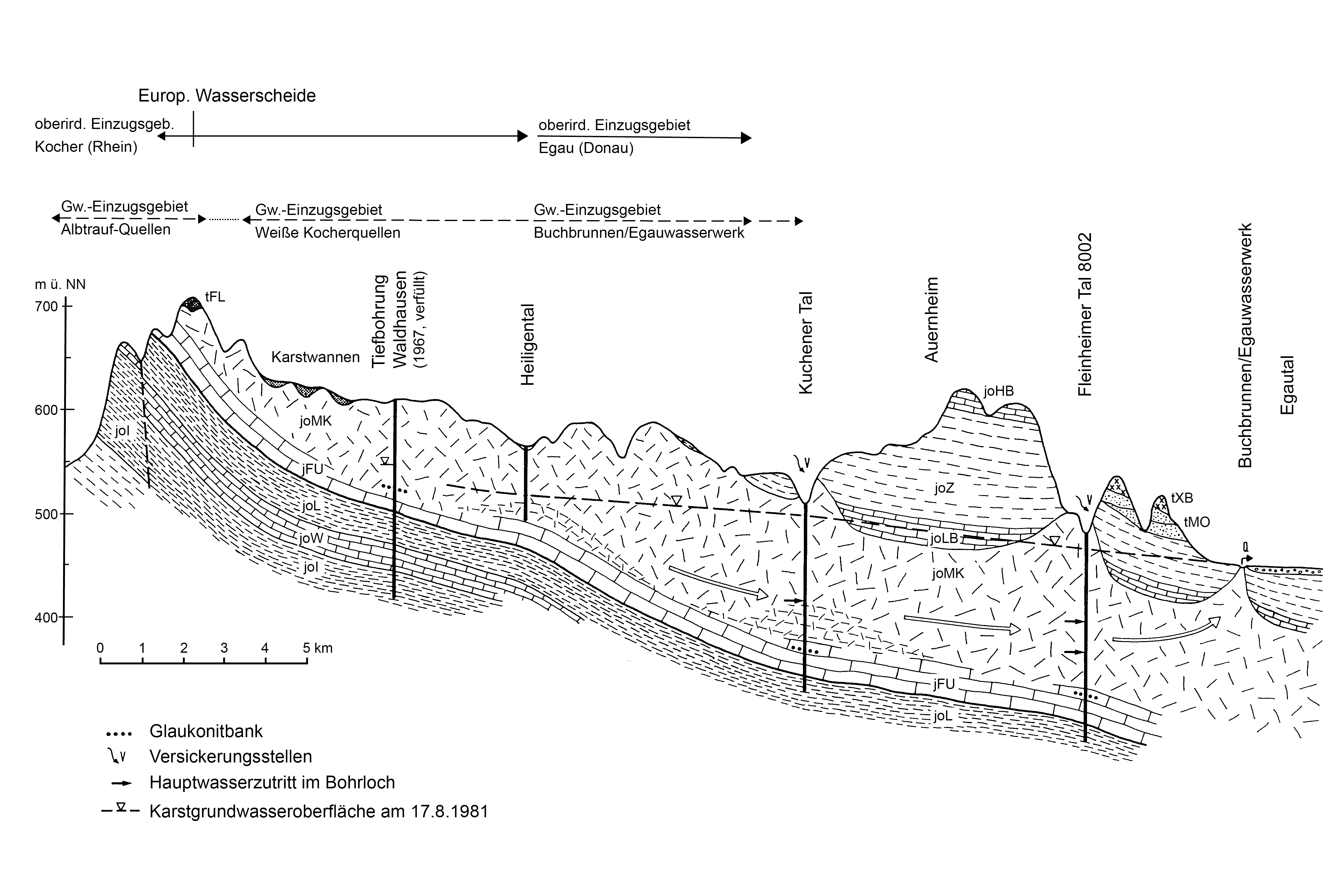 Der Karstgrundwasserleiter taucht von der Schwäbischen Alb nach Südwesten unter das Donauried, die Donau und weiter unter das südlich anschließende Molasse-Hügelland ab. Die unterschiedliche lithologische Ausprägung der Oberjuraschichten als Massenkalke, Bankkalke und Kalkmergelsteine und deren unterschiedliche räumliche Verbreitung sind für die Strömungsverhältnisse zum Donauried und für die Aufstiegswege des Karstgrundwassers in das Donauried von ausschlaggebender Bedeutung.