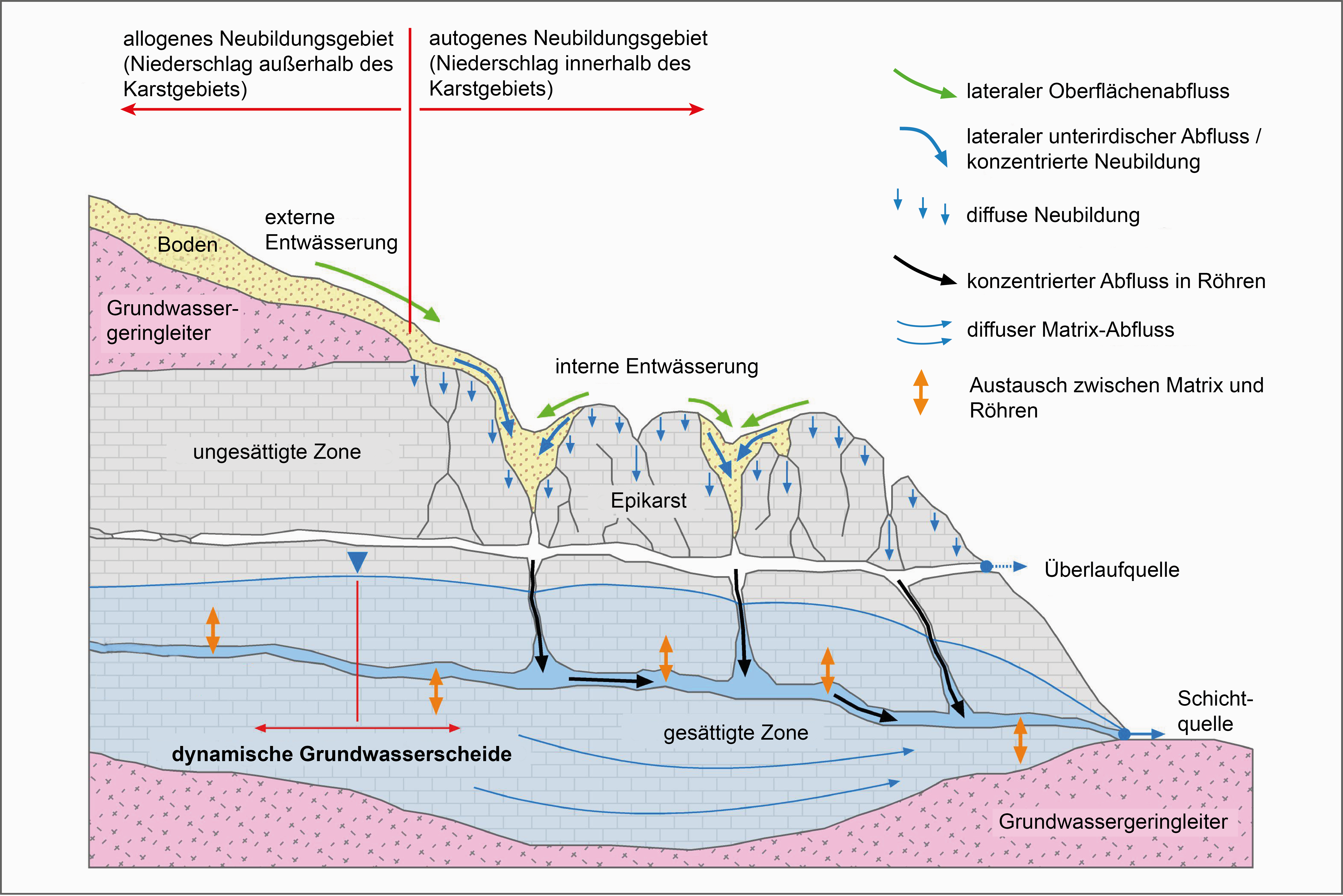Die Abflussdynamik im Karstgrundwasserleiter wird durch ein Zusammenwirken der drei Hohlraumtypen gesteuert (Sauter, 1992; Sauter, 1995; Lang, 1995; Geyer, 2008; Geyer et al., 2013).