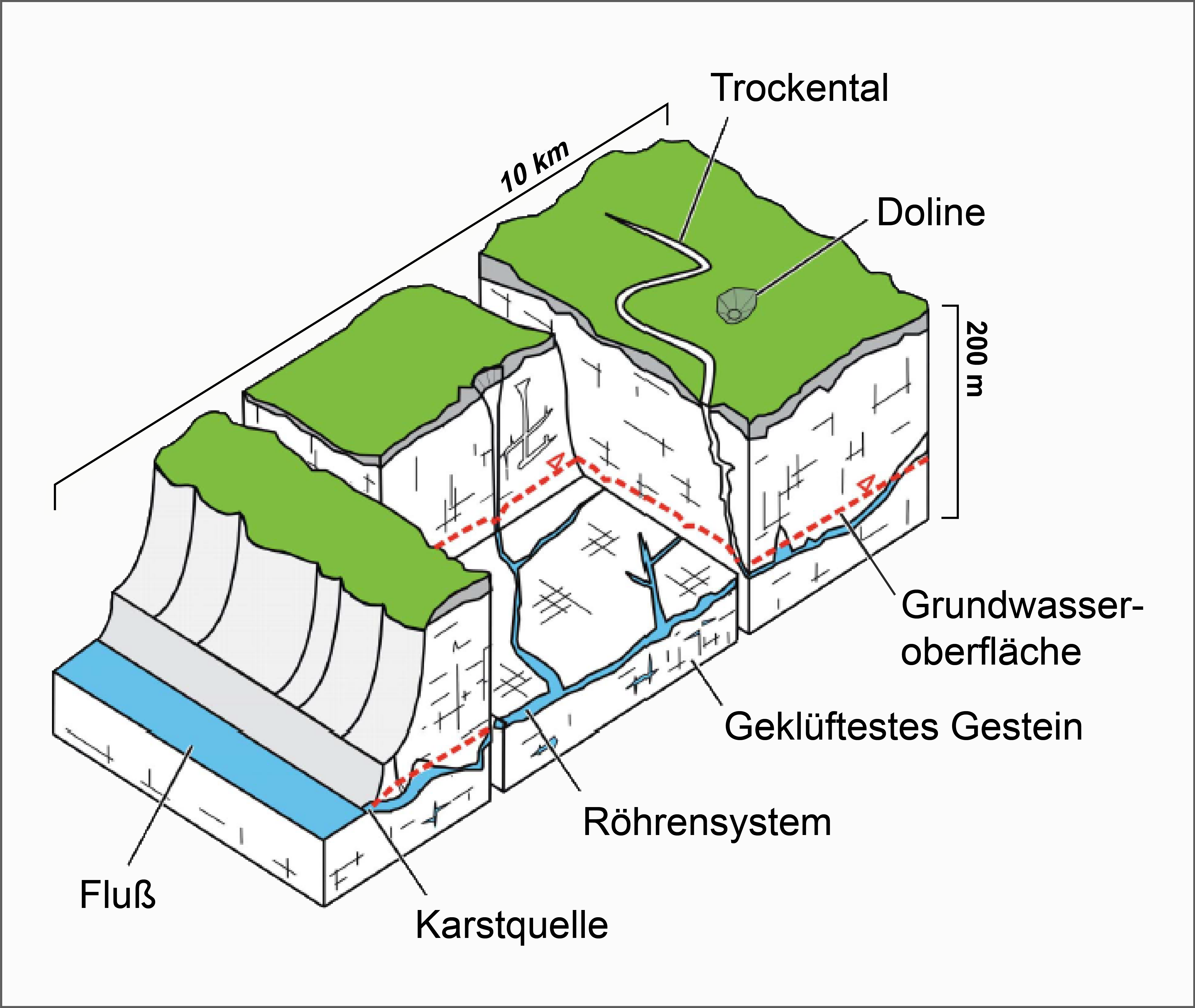 Mikroporen und kleinskalige Klüfte enthalten das langfristige Karstwasser. Sie sind für das Speichervermögen verantwortlich. Die großskaligen Abflussbahnen drainieren den Speicher und das oberflächennah abfließende Niederschlagswasser. Diese Karstwasserkomponente tritt als kurzfristiges Karstwasser an Quellen oder anderen oberflächennahen Austrittstellen (z. B. Feuchtstellen) über Tage aus. Sie kann für die qualitative Gefährdung von Wasserfassungen von großer Bedeutung sein.
